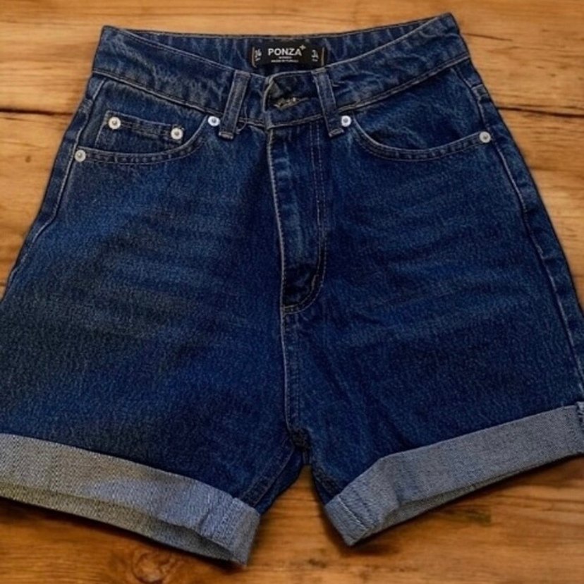 Kadınlar için düğmeli, bol kesim, koyu mavi kot şort. Sokak stili için uygun, manşetli ve rahat kesim.