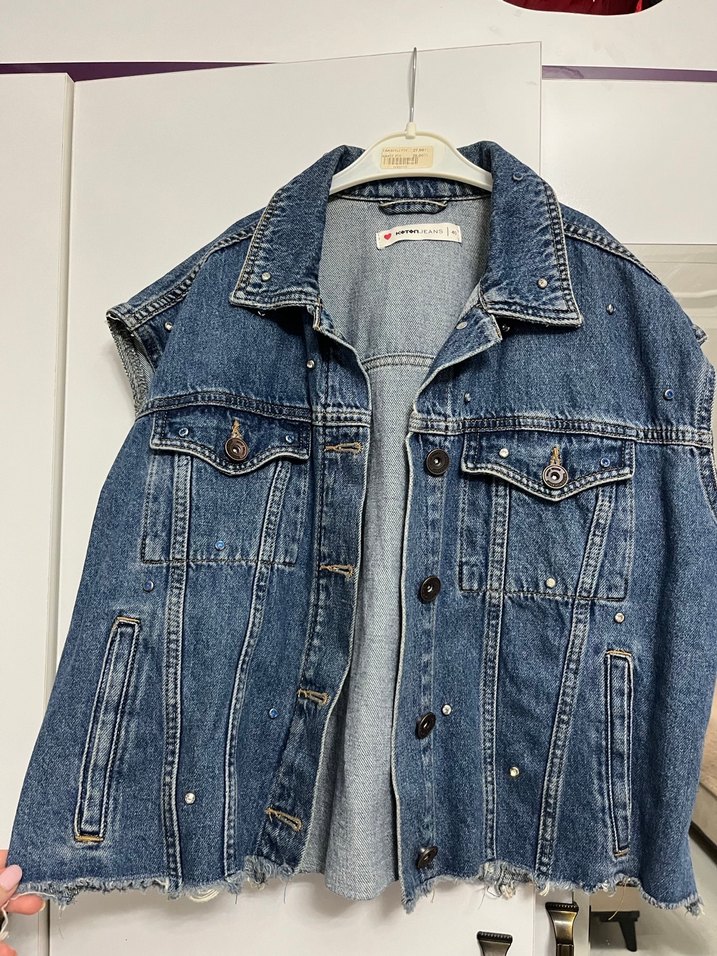 Kadınlar için düğmeli, kolsuz, bol kesim ve kesik yaka detaylı mavi-gri tonlarda kot yelek. Günlük sokak stili için uygundur.