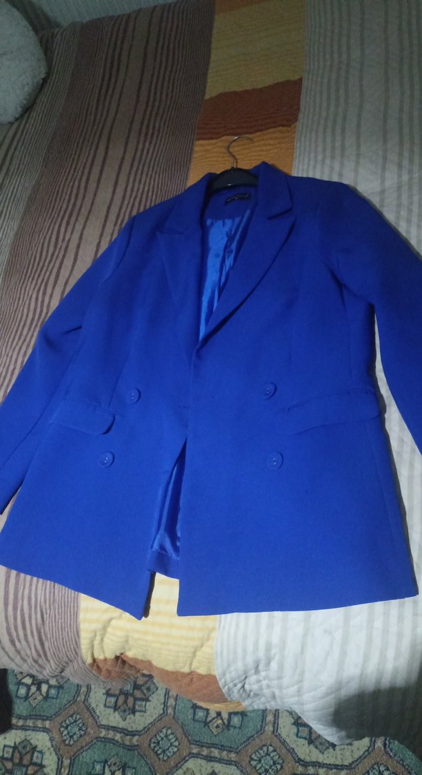 Kadın mavi blazer, düğmeli, normal kalıp ve uzun kolludur. Parlak sentetik kumaştan yapılmış, midi boyda, ofis için klasik ve sokak tarzında uygundur.