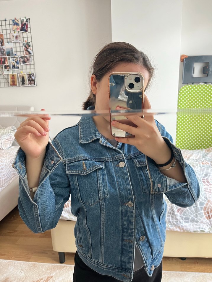 Açık mavi renkli, düğmeli ve bol kesim midi uzunlukta kot ceket. Açık yaka ve uzun kolludur, günlük kullanıma uygundur.