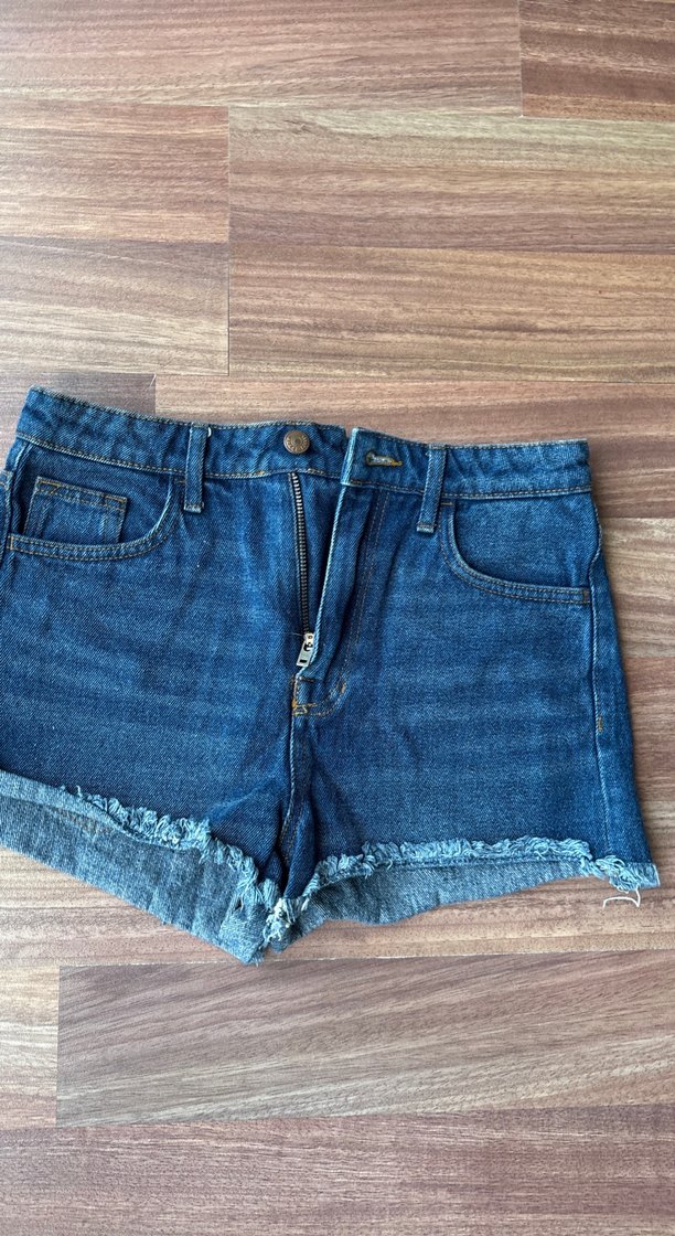 Kadınlar için loose fit kesim, düğmeli, koyu mavi kot kumaştan yapılmış, yıpranmış kenar detaylı mini şort. Günlük rahat sokak stili için uygun.