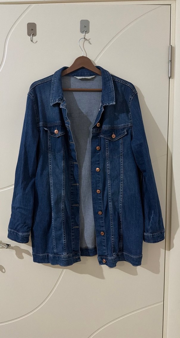 Kadınlar için uzun kollu, düğmeli, notched lapel yakalı, bol kesim mavi denim ceket. Günlük kullanıma uygun normal boyda.