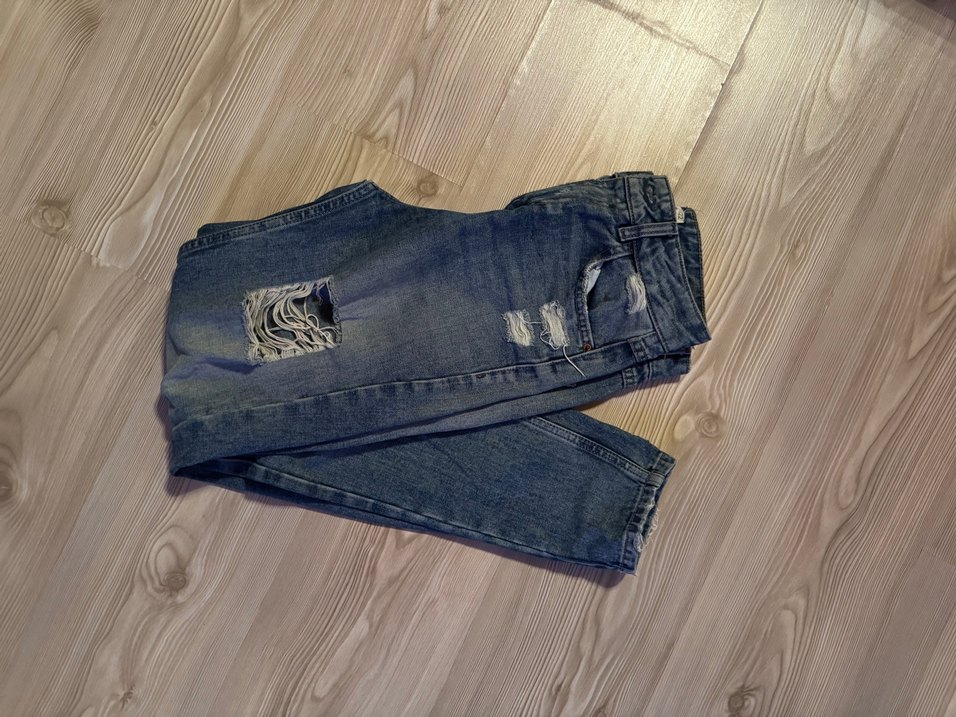Mav renk, düğmeli ve yırtık detaylı, salaş kesim midi uzunlukta kadın kot pantolon. Günlük kullanıma uygun rahat tarzda.