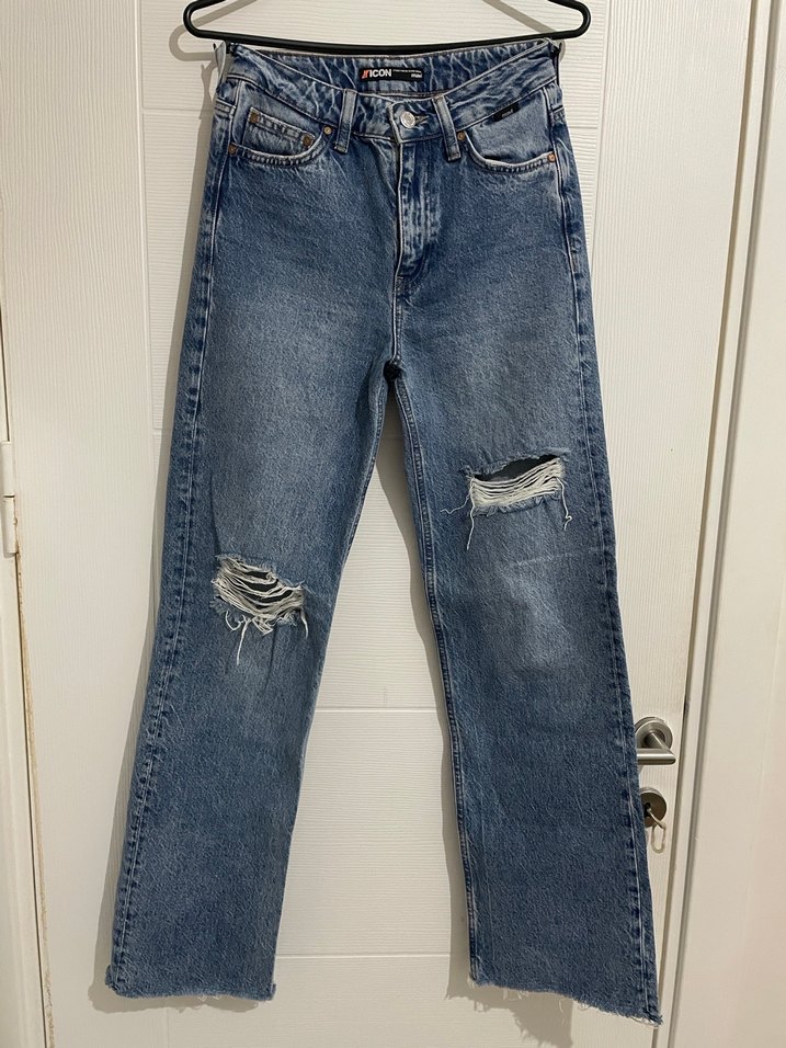 Kadın Mavi Düz Kesim Yırtık Kot Pantolon