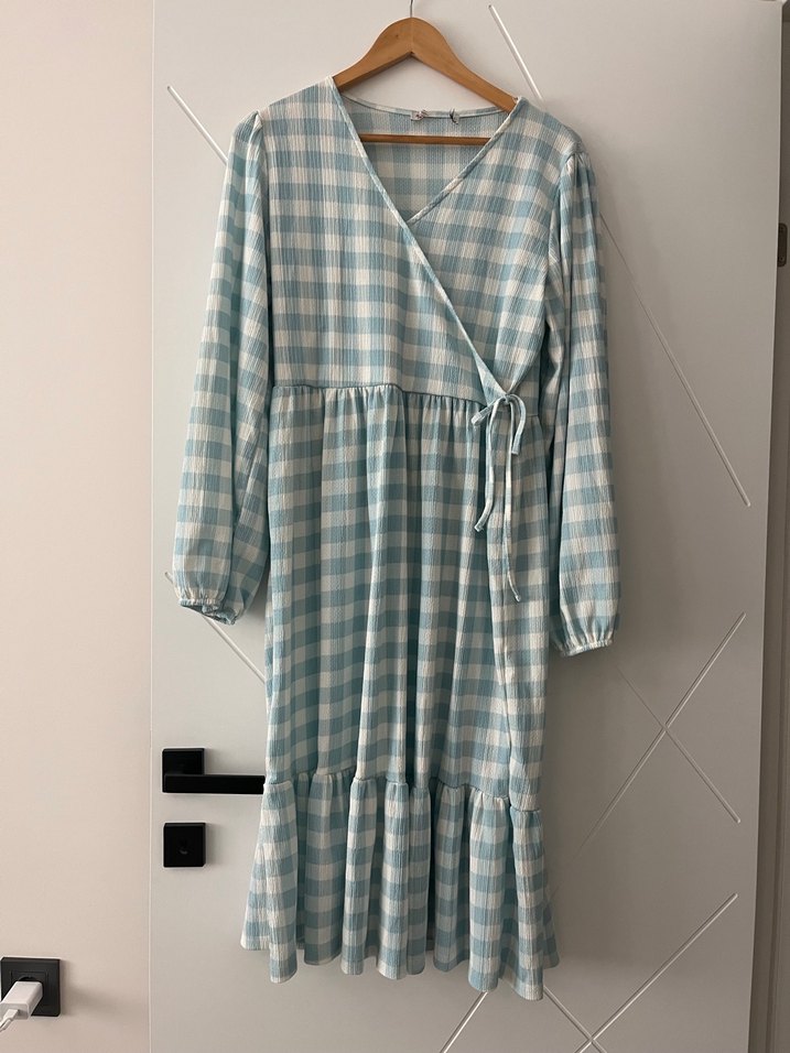 Kadınlar için uzun, bol kesim elbise. V yaka, pileli detaylar, uzun kollu ve yumuşak sentetik kumaş. Pastel mavi ekose deseni günlük kullanıma uygun.