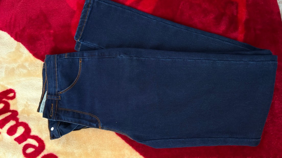 Elastik bel bantlı, mavi renkli, normal midi boyda, dar kesim kadın denim pantolon. Günlük ve sokak stiline uygundur.
