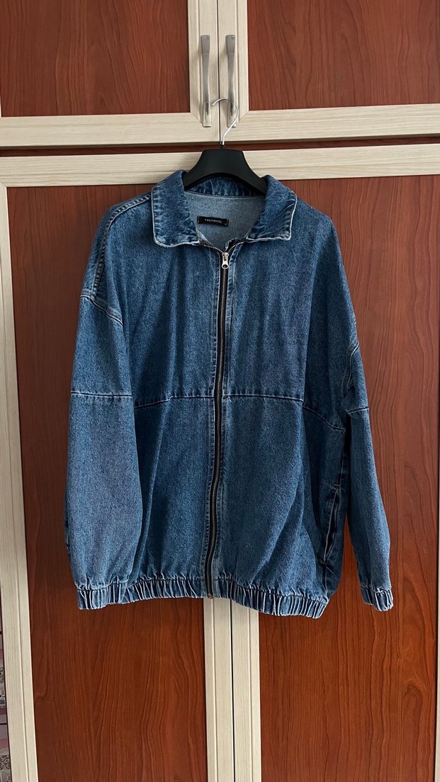 Bu koyu mavi denim ceket, kesik yaka, uzun kollu ve bol kesimdedir. Fermuarlı ön ve lastikli etek ucu ile rahat sokak stiline uygundur.