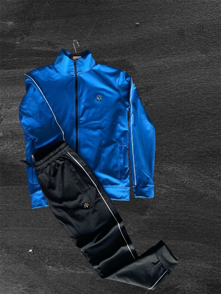 Kadınlar için koyu mavi fermuarlı, yakası kesimli ve uzun kollu eşofman üstü ile siyah pantolondan oluşan takım. Rahat kesim, yumuşak dokulu ve dış mekan kullanımı için uygun. ♀️