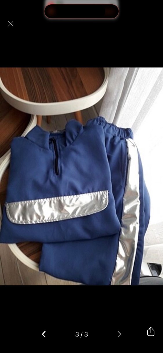 Kadınlar için parlak mavi renkli, uzun kollu ve fermuarlı kısa eşofman takımı. Rahat kesimli ve yumuşak, sıcak tutan kumaştan üretilmiştir. Sokak stili için reflektör detaylı sade tasarım.