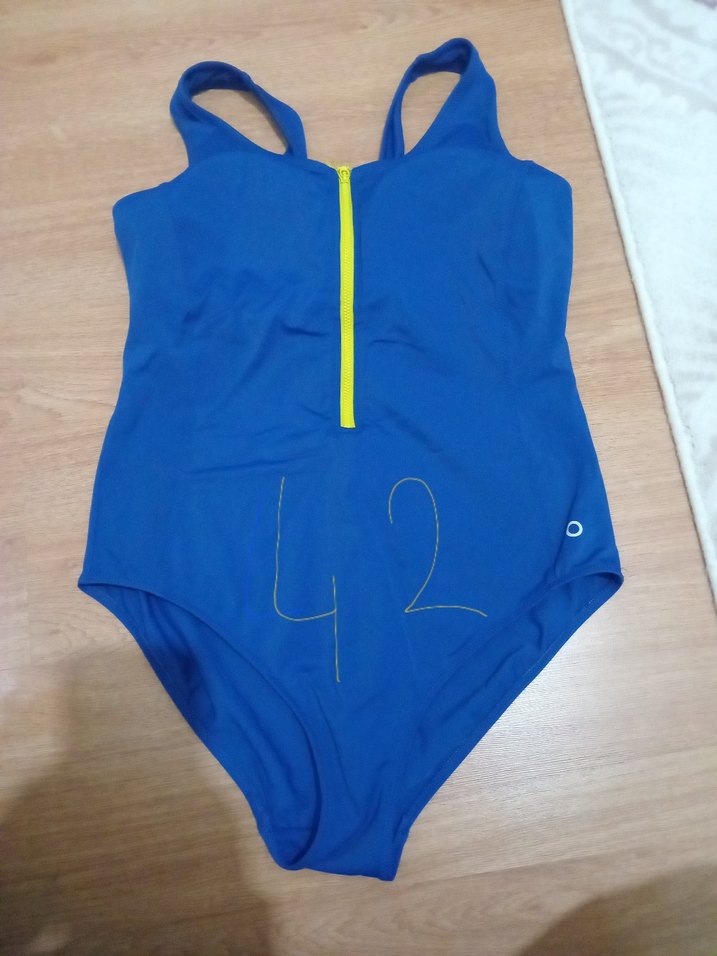 Mavi renkli, fermuarlı ve kolsuz kadın mayo, normal midi boyda, şık ve rahat bir plaj kıyafeti olarak öne çıkar.