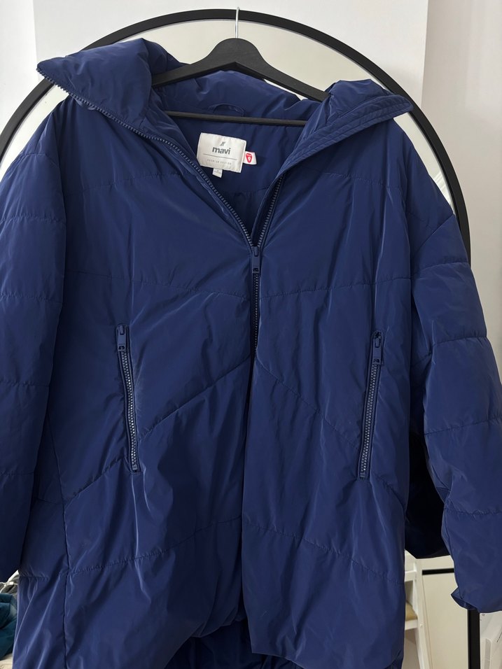 Kadınlar için uzun kollu, fermuarlı, normal boyda mavi parlak mont. Notlu yakalı, bol kesim ve yumuşak sıcak kumaştan yapılmıştır. Oversize 42 uyumlu