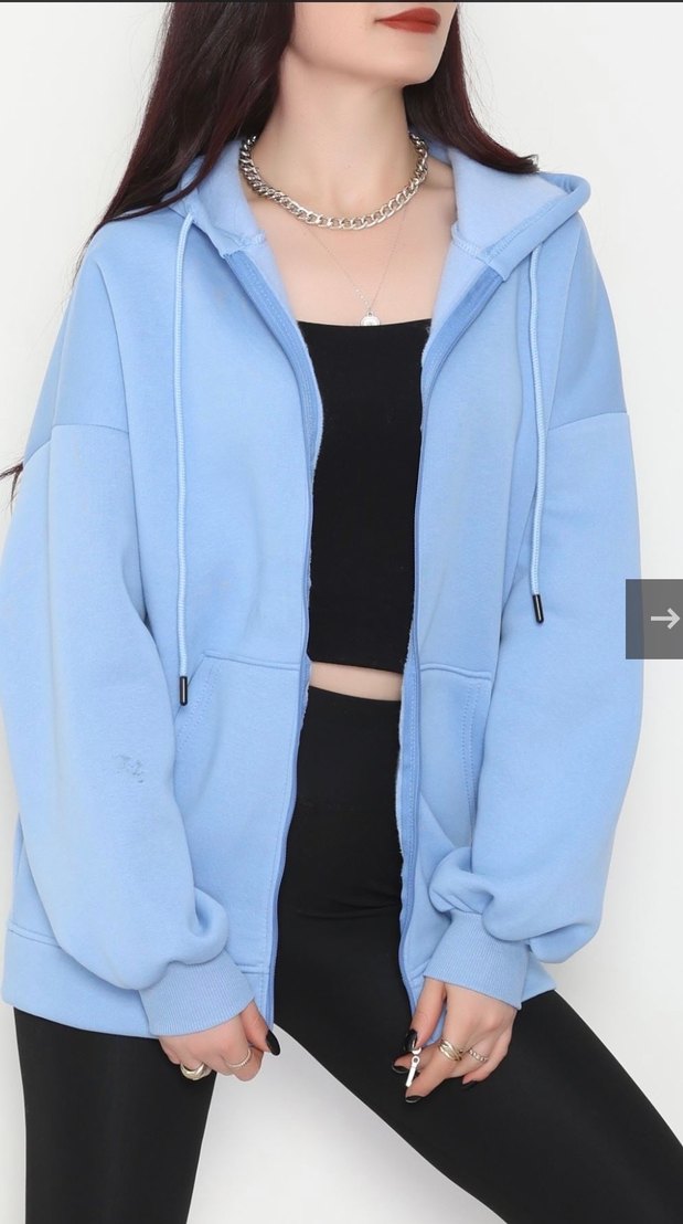 Pastel mavi renkte, fermuarlı ve oversize kesim uzun kollu kadın sweatshirtü. Normal midi boy, yuvarlak yaka ve yumuşak, sıcak kumaştan üretilmiştir. Rahat günlük kullanım için uygundur. Hiç giyilmedi etiketi üzerinde . Ürün dar geldiği için ve iade sürecini kaçırdığım için satıyorum