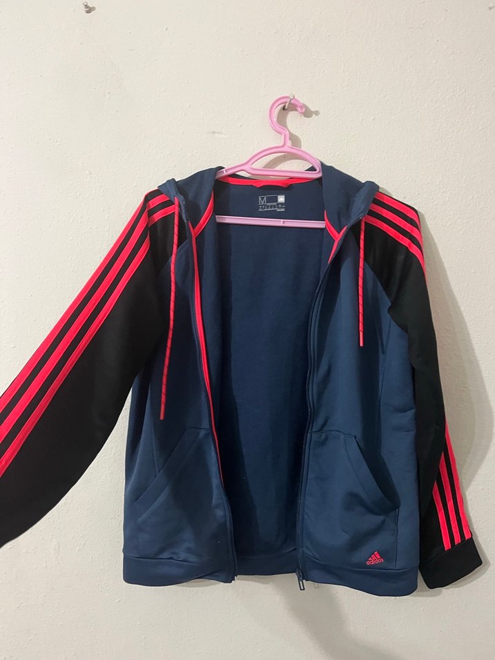 Fermuarlı, yüksek yakalı ve uzun kollu kadın spor ceketi. Sentetik kumaştan, koyu mavi ve siyah renklerde, canlı pembe baskılı çizgilerle sportif ve günlük kombinlere uygun.