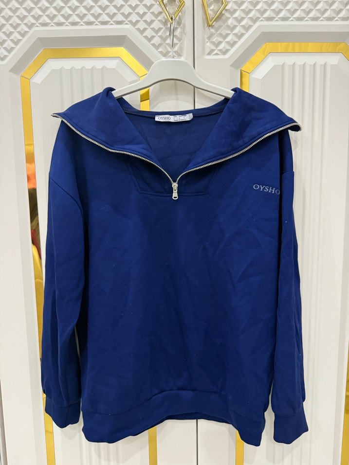 Uzun kollu, yuvarlak yakalı, fermuarlı koyu mavi sweatshirt. Rahat kesimli ve yumuşak, sıcak kumaştan üretilmiştir. Desensiz ve günlük sokak stili için uygundur. "OYSH" markası baskılıdır. Az kullanıldı L bedendir