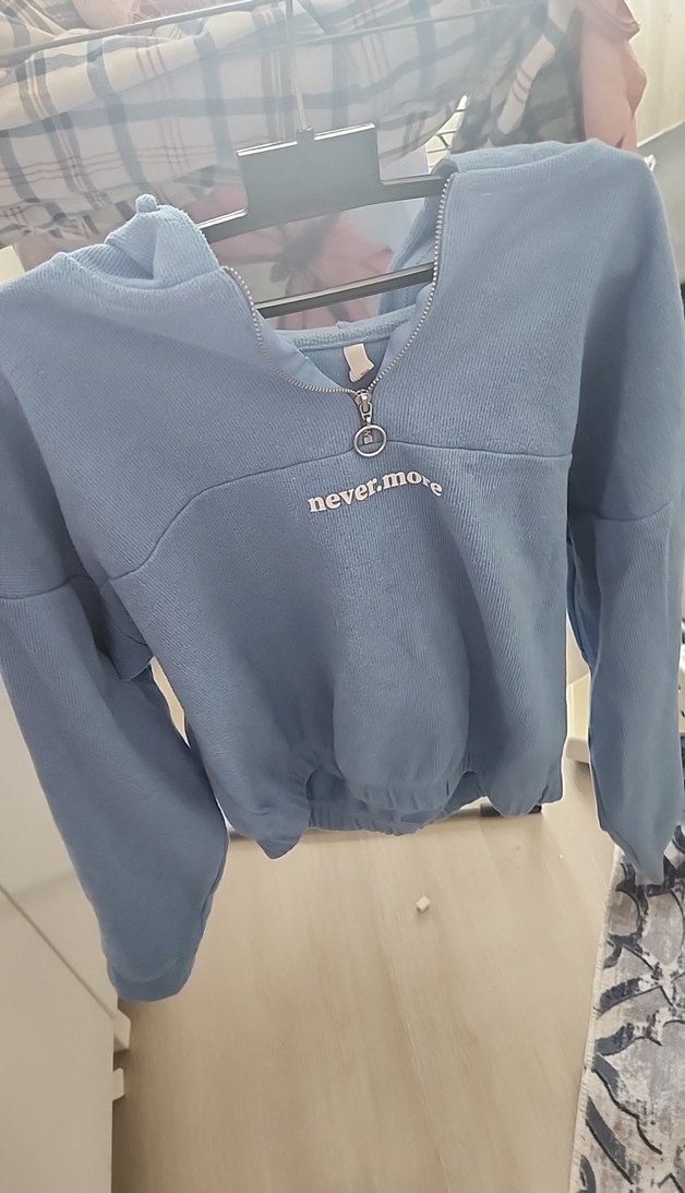 Kadın sweatshirt, yuvarlak yaka, uzun kollu, bol kesim ve midi boyda. Önünde fermuarlı ve 'never.more' baskılı. Yumuşak ve sıcak kumaştan yapılmıştır.