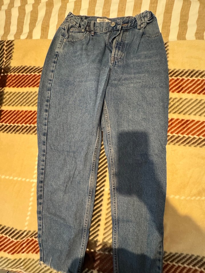 Kadınlar için geniş kesim ve normal boyda, mavi kot kumaştan yapılmış pantolon. Kemer tokalı ve hafif batik desenli, günlük rahat sokak stili için uygun.