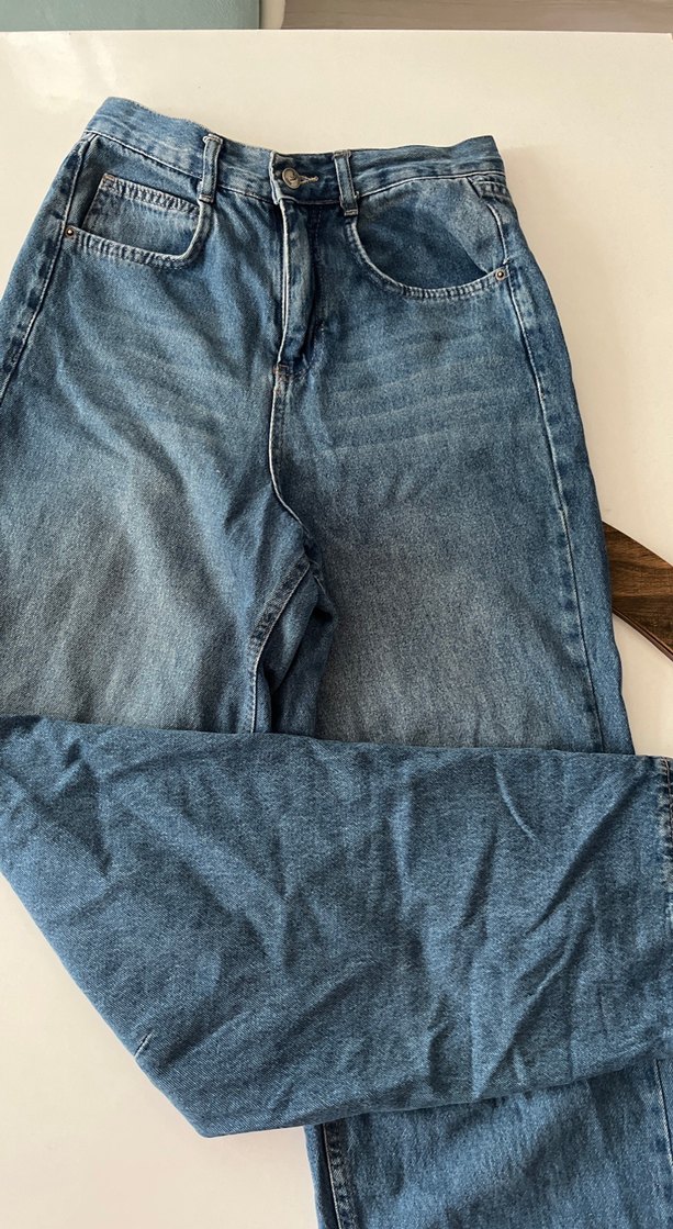 Kadınlar için mavi kot pantolon, geniş kesim ve normal boyda. Günlük kullanıma uygun rahat ve zahmetsiz şıklık sunar.