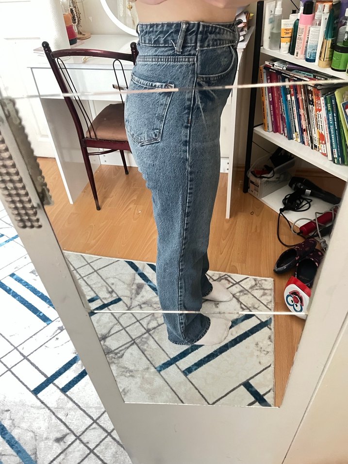 Geniş kesim, midi boy mavi kot pantolon, tokalı detaylıdır. Rahat ve gündelik kullanıma uygundur.