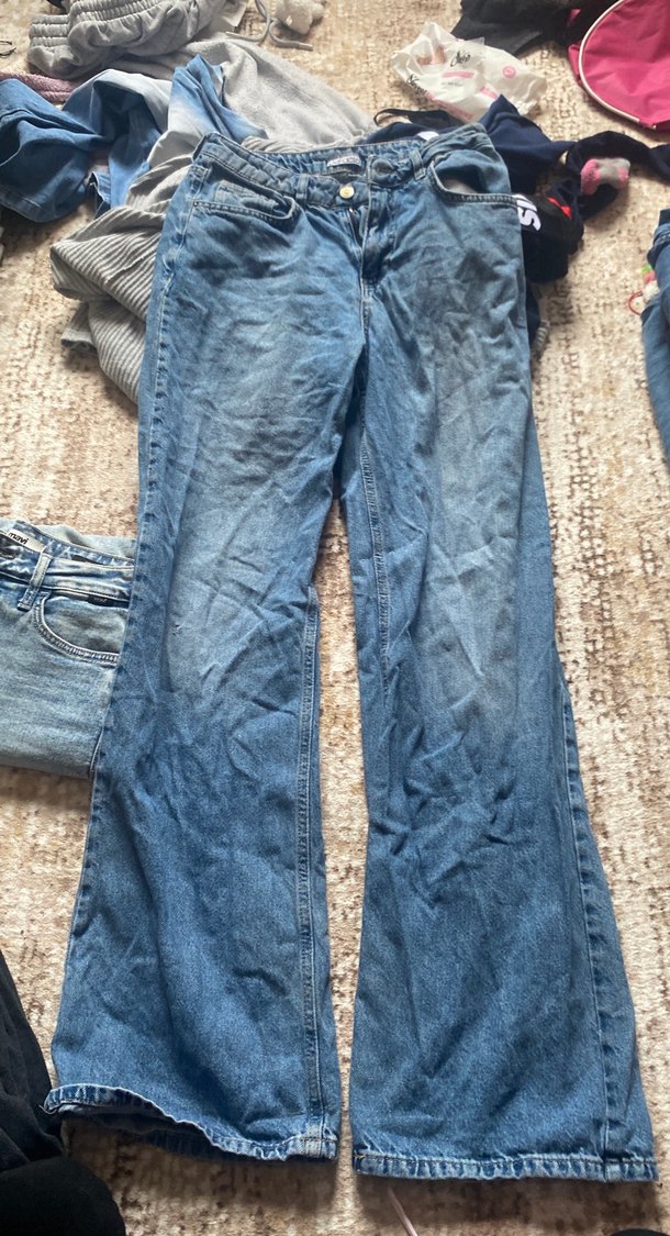 Geniş paça, normal boy mavi denim pantolon, günlük kullanım için rahat ve desen içermeyen normcore tarzıyla dikkat çekiyor.