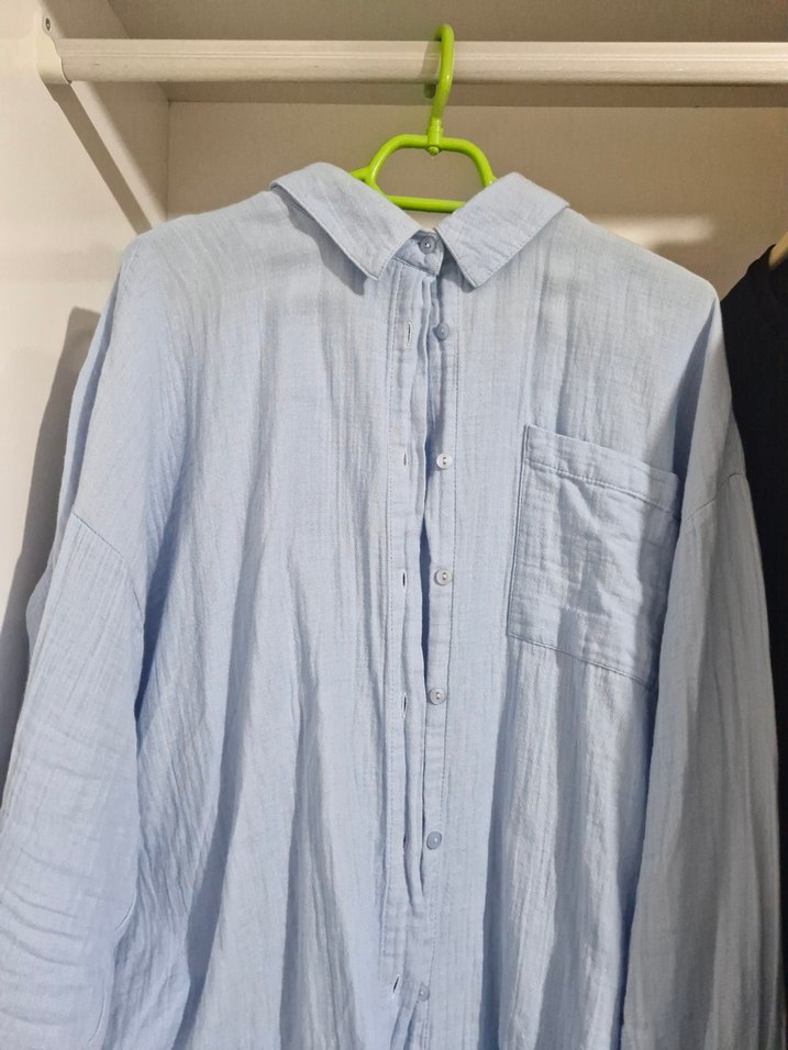 Sadece birkaç kere giyilmiş temiz ve defosuz oversize gömlek. Uzun kollu, düğmeli, yakalı ve cep detaylı mavi keten gömlek. Rahat kesimi ve yumuşak dokusuyla gündelik kullanıma uygun.