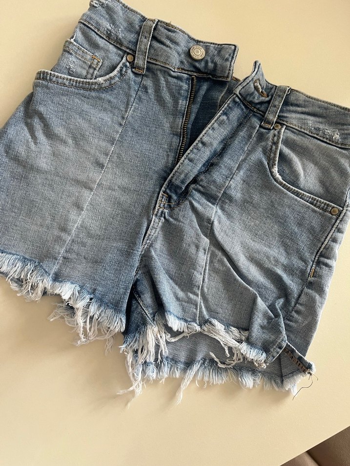 Kadınlar için bol kesim, kısa boylu denim mini şort. Mavi ve gri tonlarıyla salaş ve şık bir görünüm sağlar, günlük kullanım için uygundur.