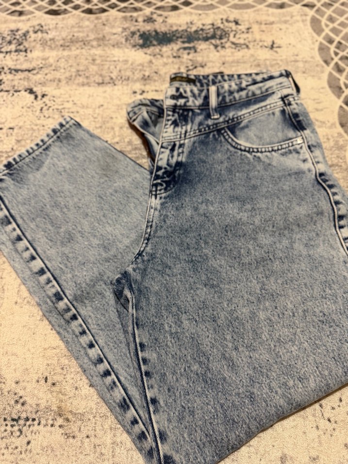 Mavi-gri denimden üretilmiş, düğmeli, bol kesim kadın jean. Normal boyda ve günlük kullanım için uygundur.