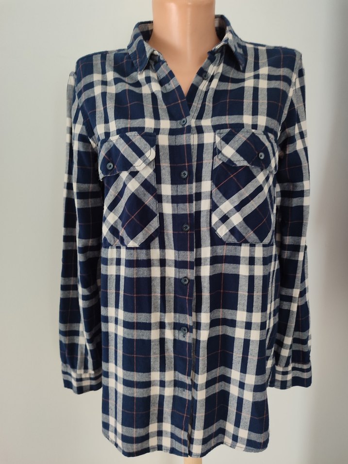 Pamuk kumaştan, düğmeli ve yakalı, mavi ve gri ekose desenli, bol kesim uzun kollu kadın gömleği. Günlük sokak stiline uygun.