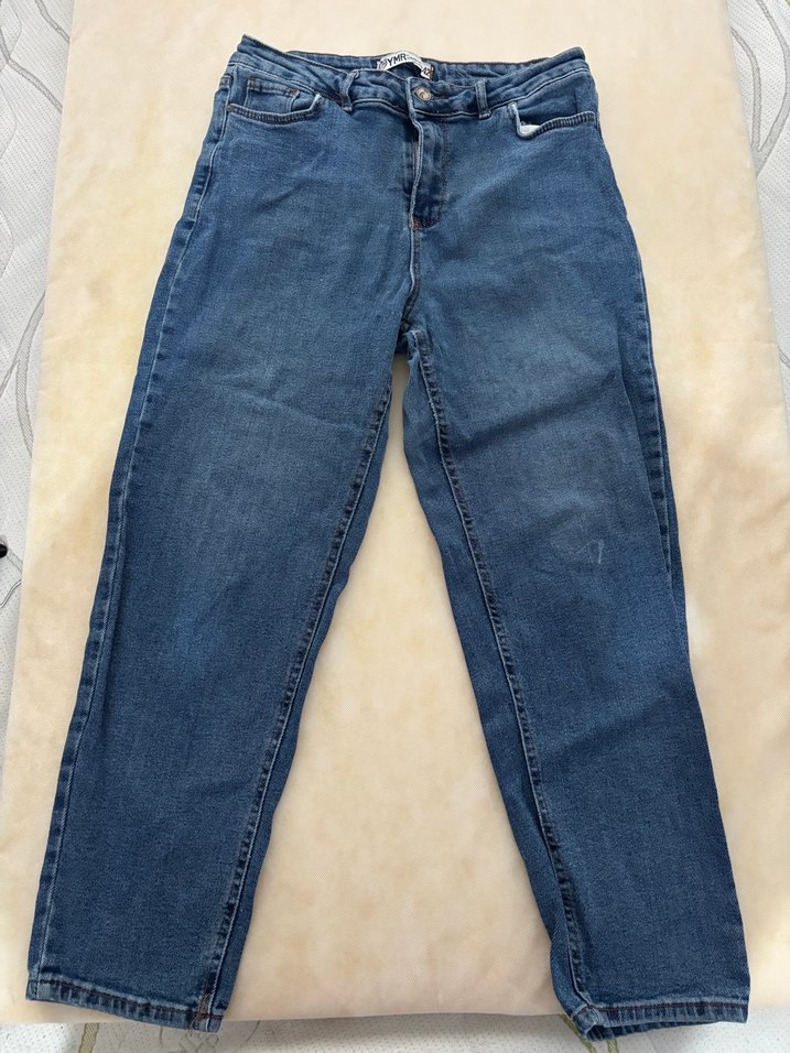 Kadınlar için mavi gri midi boy, bol kesim ve sade tasarımlı dayanıklı kot pantolon. Günlük kullanıma uygun.