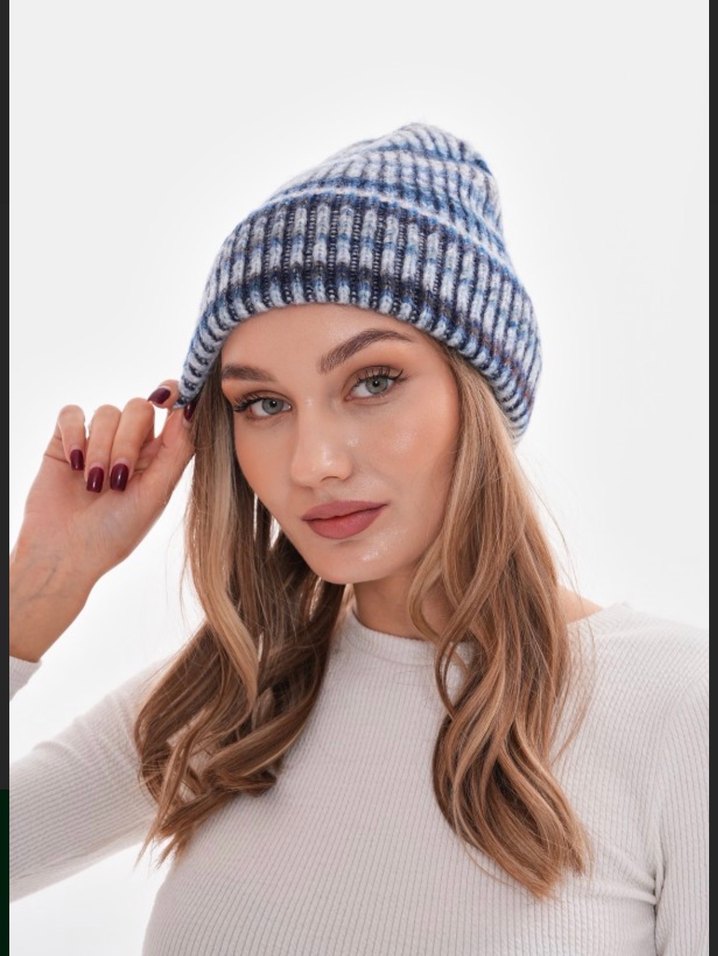 Mavi ve gri tonlarda, yumuşak örgüden yapılmış rahat örgü bere. Trendy casual sokak stili için uygun.