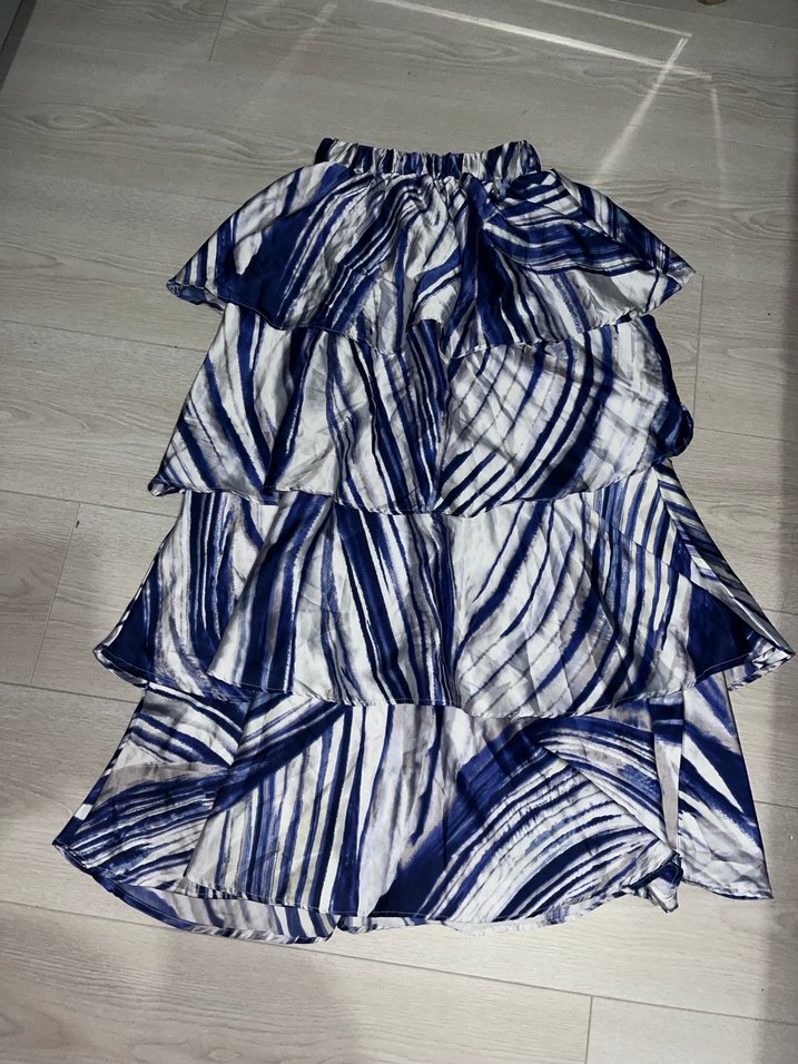 Kadınlar için uzun, bol kesim fırfırlı etek, mavi-gri batik desenli, yumuşak sentetik kumaştan, günlük kullanım için uygun.