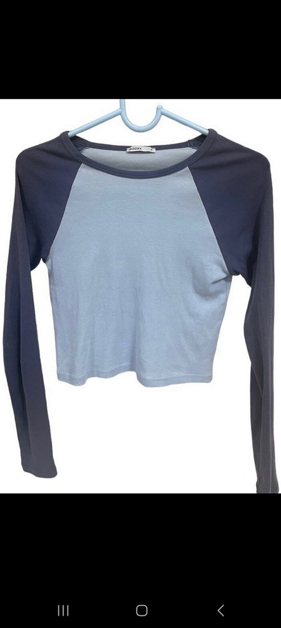 Pamuk kumaştan, mavi ve gri renklerde, uzun kollu ve dar kesim kadın crop top. Sokak modasına uygun, günlük rahat kullanıma ideal.