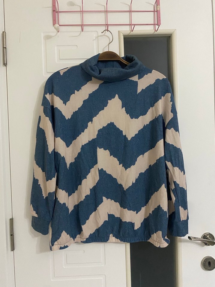 Kadınlar için yüksek yakalı, bol kesim ve örgü keten kumaştan yapılmış kazak. Mavi ve gri batik desenli, uzun kollu, rahat ve trend sokak stili kazak.