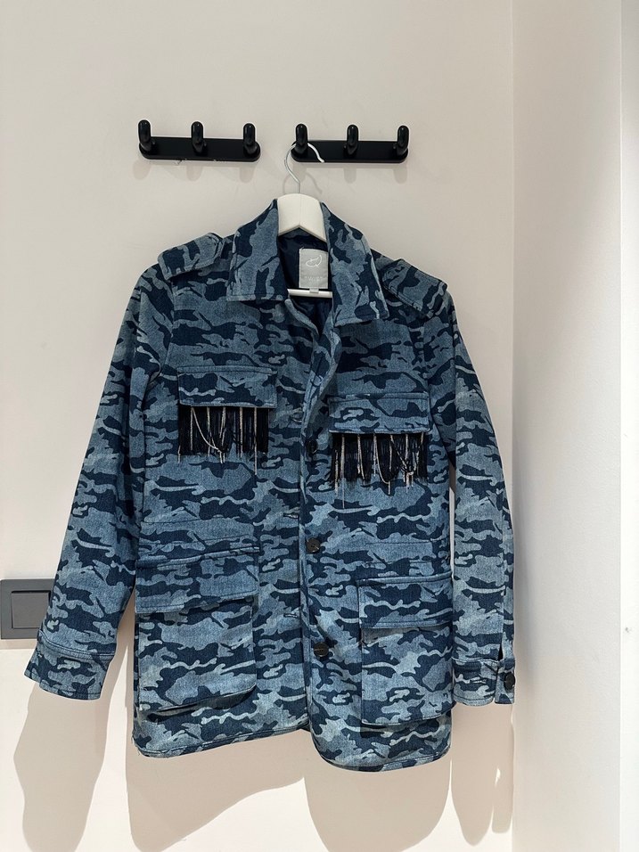 Mavi ve gri kamuflaj desenli, düğmeli, bol kesim kadın ceketi.