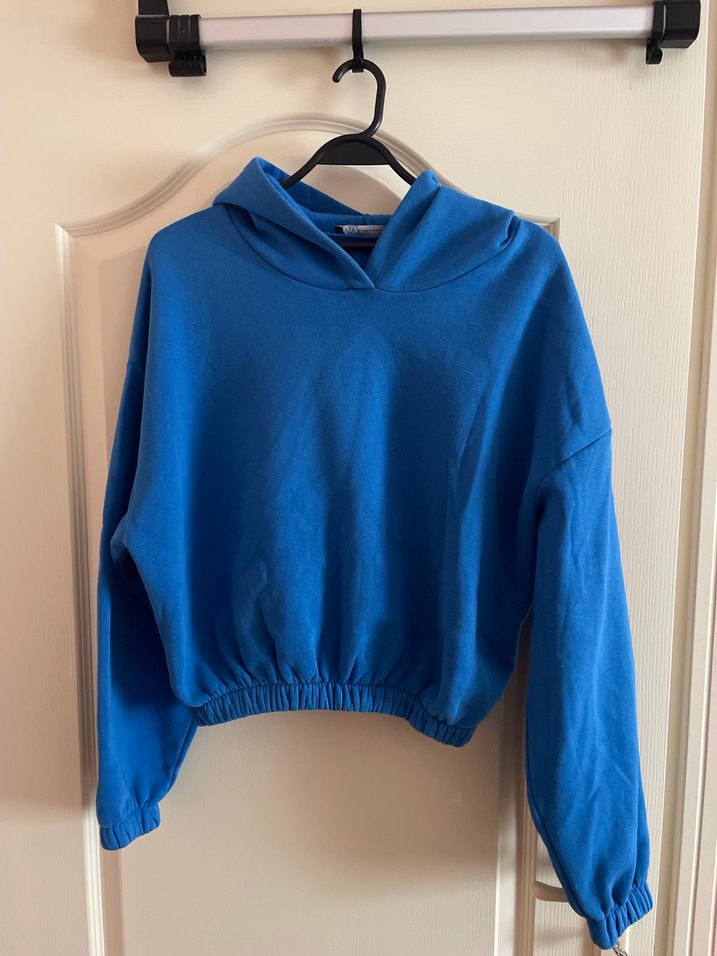 Kadınlar için mavi kapüşonlu sweatshirt, bol kesim ve uzun kollu. Yumuşak ve sıcak kumaştan, günlük kullanıma uygun rahat eşofman takımı. Etek ve manşetlerde lastik detaylar bulunur.