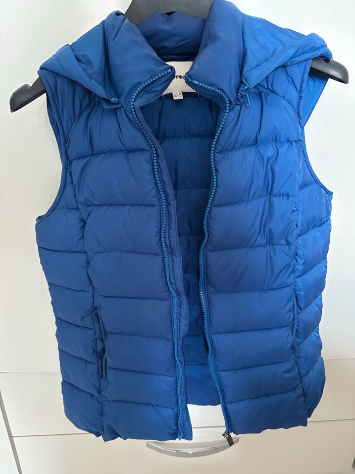 Koyu mavi, fermuarlı, kapüşonlu ve kolsuz yelek. Yumuşak sentetik kumaştan, normal boyda ve vücuda oturan kesimle dış mekan kullanımı için uygun. Çıkarılabilir kapüşonlu kadın yelek mont