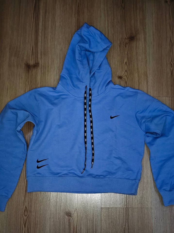 Kadınlar için uzun kollu, yuvarlak yaka, yumuşak ve sıcak kumaştan yapılmış mavi kısa kesim crop sweatshirt. Kapüşonlu ve bağcıklı, rahat kesim, spor ve günlük kullanıma uygun. Nike logolu. Hiç giyilmedi. Sanırım denerken kapusonunda bir ruj lekesi oluşmuş, temizlenirse geçer. Marka temsilidir. XS/S uyumludur.