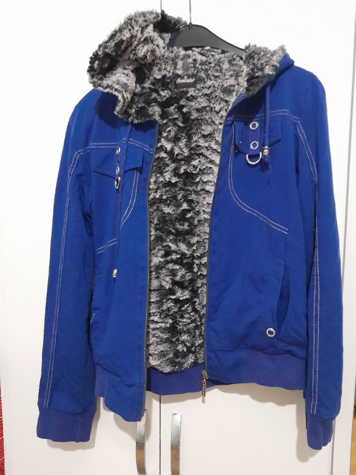 Kadın kapüşonlu, kürklü iç detaylı, bol kesim ve normal boyda mavi streetwear tarzı ceket. Uzun kollu, günlük kullanıma uygun yumuşak ve sıcak iç yüzeylidir. S beden defosuz.