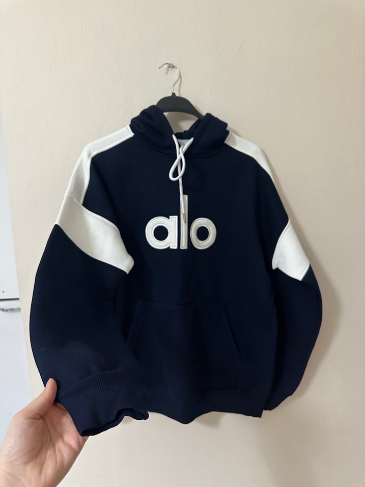 Kadınlar için mavi kapüşonlu, bol kesim sweatshirt. Beyaz baskılı detaylar yumuşak ve sıcak kumaştan üretilmiştir.