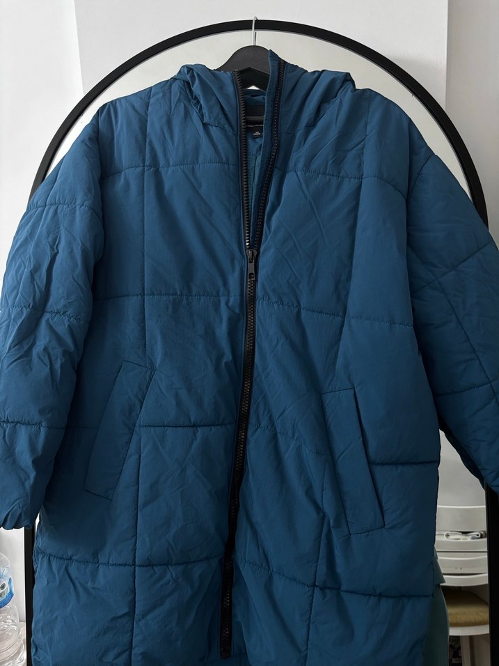 Kadınlar için fermuarlı, kapüşonlu, notched yaka ve strappy kollu midi boy, rahat kesim mavi kaban. Sıcak ve yumuşak kumaştan, günlük kullanıma uygun. L M uyumlu geniş kesim