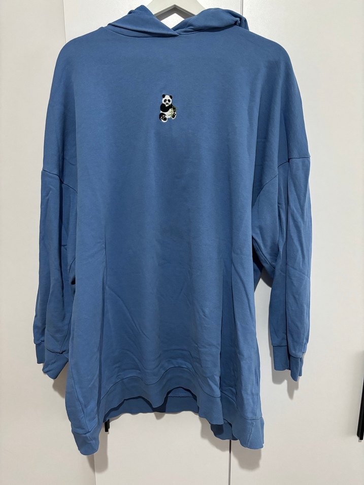 Kadın mavi sweatshirt, uzun kollu, bisiklet yaka ve rahat kesime sahip. Yumuşak kumaştan üretilmiş, baskılı panda deseni ve düğme detayları bulunur. 3XL defosu mevcut görsel eklenmiştir