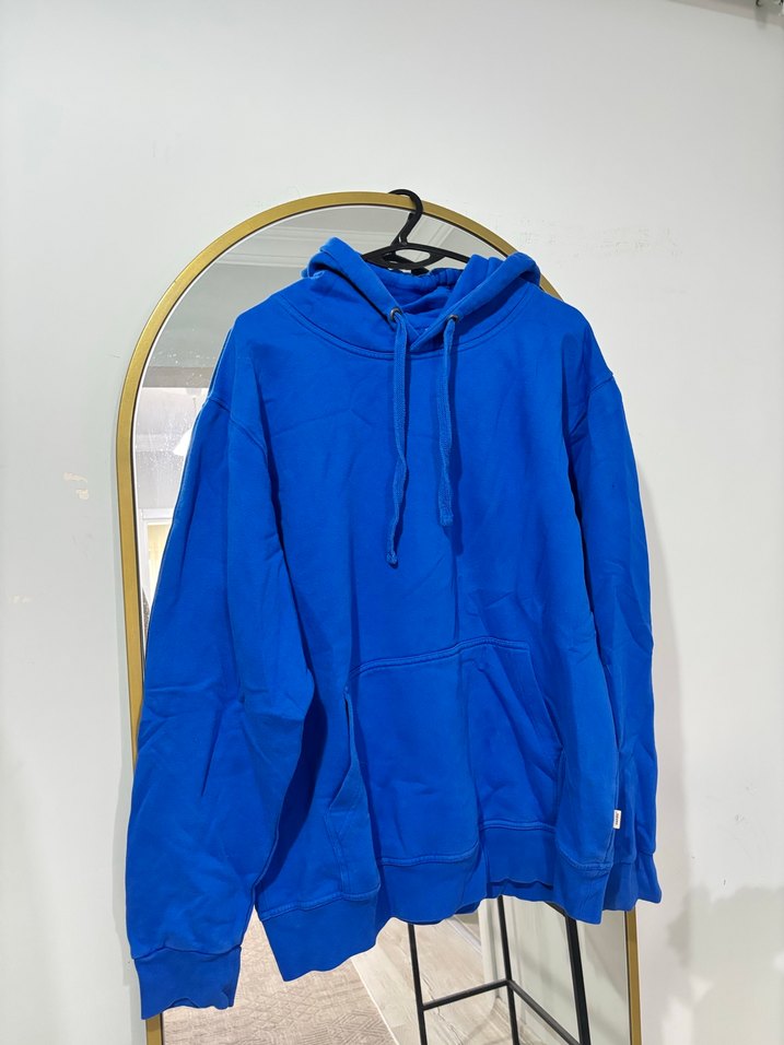 Bu koyu mavi kapüşonlu sweatshirt, salaş kesimi ve uzun kollarıyla yumuşak ve sıcak bir kumaştan üretilmiştir. Günlük kullanım için rahat ve şık bir görünüm sunar.
