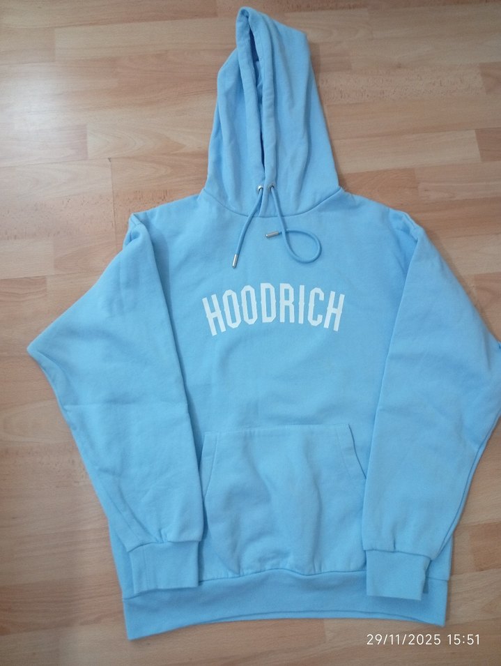 Kadınlar için pastel mavi renkte, bol kesim, kapüşonlu ve uzun kollu sweatshirt. Önünde 'HOODRICH' baskısı bulunur, rahat ve sıcak kumaştan üretilmiştir.