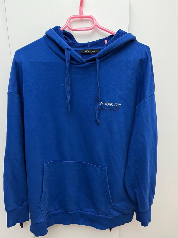 Kadın mavi kapüşonlu sweatshirt, uzun kollu ve bol kesimdir. Önünde cep ve 'WYORK CTY' baskısı vardır. Rahat sokak stili için uygundur.