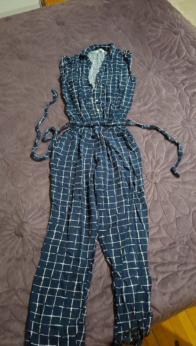 Kadınlar için kemerli, kare desenli mavi tulum. Notlu yaka ve askılı kollara sahip, günlük sokak stiline uygun.3.düğmesinin teki yok başka hiç bi sorunu yoktur.