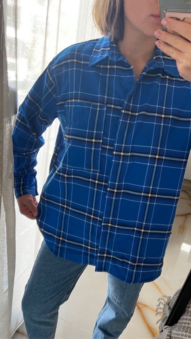 Bol kesim, uzun kollu, yakalı ve düğmeli ön kısmı olan koyu mavi kareli, yumuşak ve sıcak kumaştan kadın gömleği. Günlük rahat kullanım için uygundur.