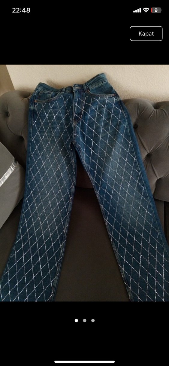 Koyu mavi denim pantolon, kareli desenli ve payetli detaylara sahip. Normal boy ve regular fit, sokak stili için uygun.
