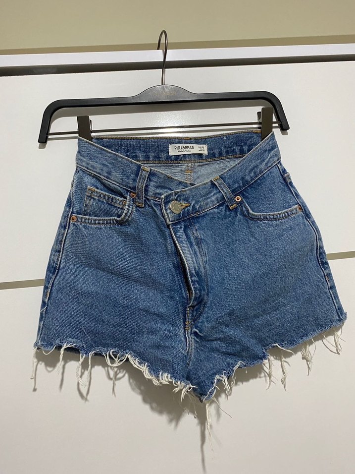 Kadınlar için kemer detaylı, bol kesim mavi kot şort. Uçları yıpranmış, desen içermeyen kısa paça, günlük sokak stiline uygun.
