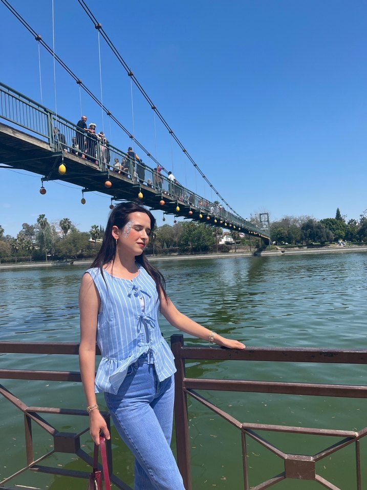 Kadınlar için kemerli, düz yakalı ve kolsuz denim bluz. Mavi, parlak çizgili ve normal midi boyda, rahat kesim. Sokak stili ve açık hava kullanımı için uygundur.