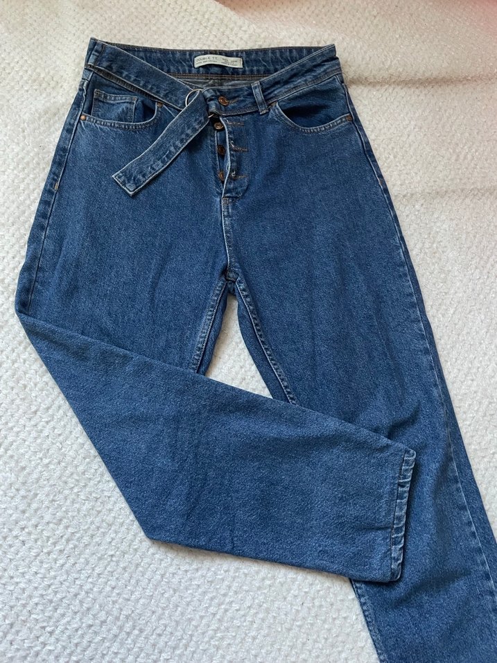 Kadınlar için kemerli, mavi renkli regular fit denim pantolon. Normcore tarzda, normal boy ve desensiz tasarıma sahip, günlük kullanıma uygun. Double TT marka 1 kere giyildi