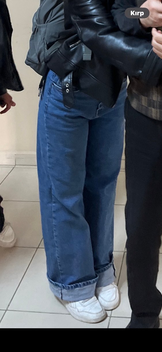 Mavi renkte, kemerli ve midi boyda, geniş paça kadın kot pantolon. Rahat ve günlük sokak stiline uygun.